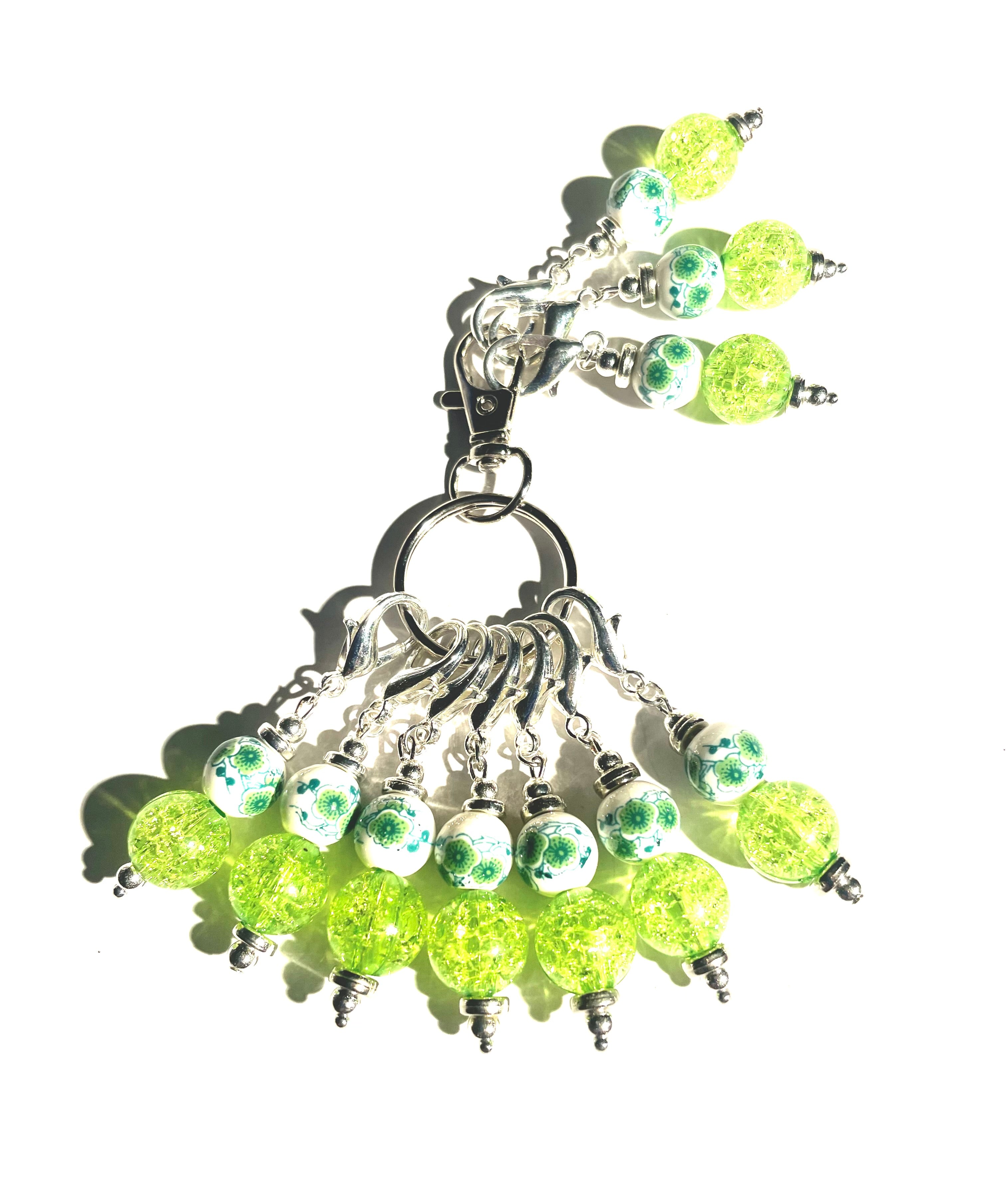 Materials: 12mm Light Green Acrylic Crackle beads, 10mm white / green flowering painted ceramic beads, silver plated spacers beads, and lobster clasps. Including the Stitch Markers silver plated ring holder