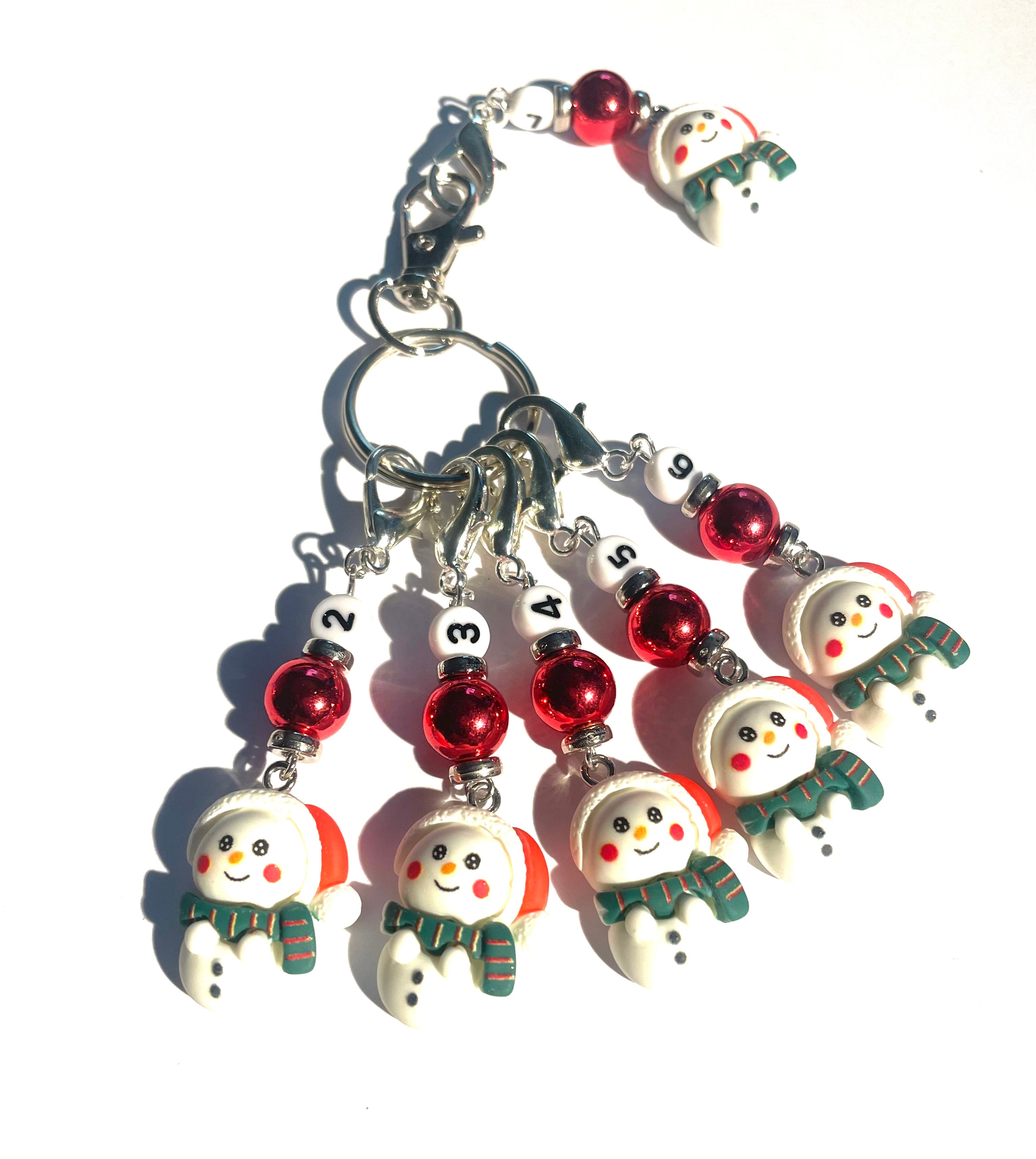 Materials: 6 Snowman Resin Charms, 8mm Red festive beads, white numbers beads, silver plated spacers and lobster clasps. Including the silver plated the Stitch Markers ring holder