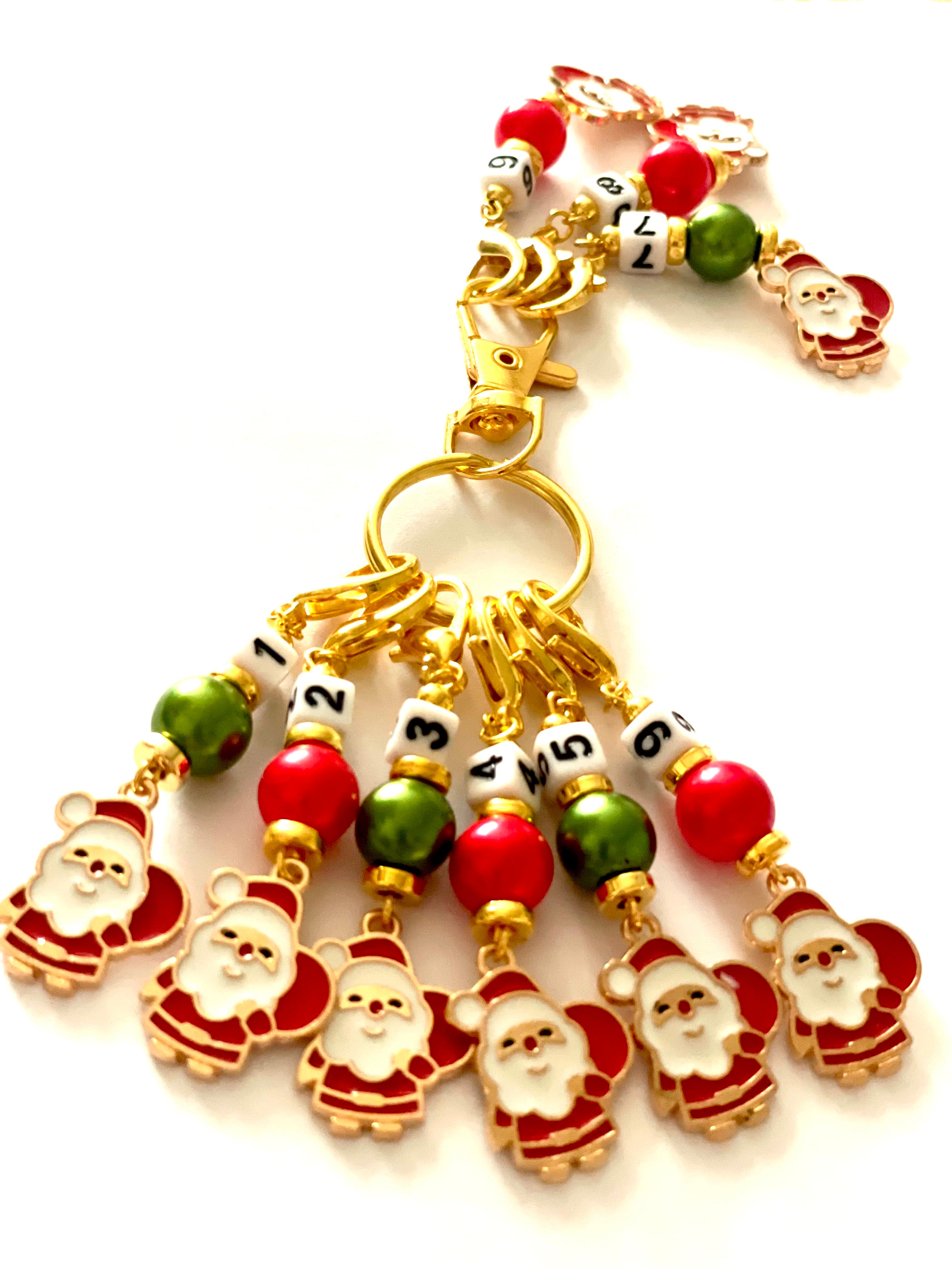 Materials: 9 Santa Claus enamel charms, 10mm red / green pearls, gold plated spacers and lobster clasps. Including the gold plated Stitch Markers holder.