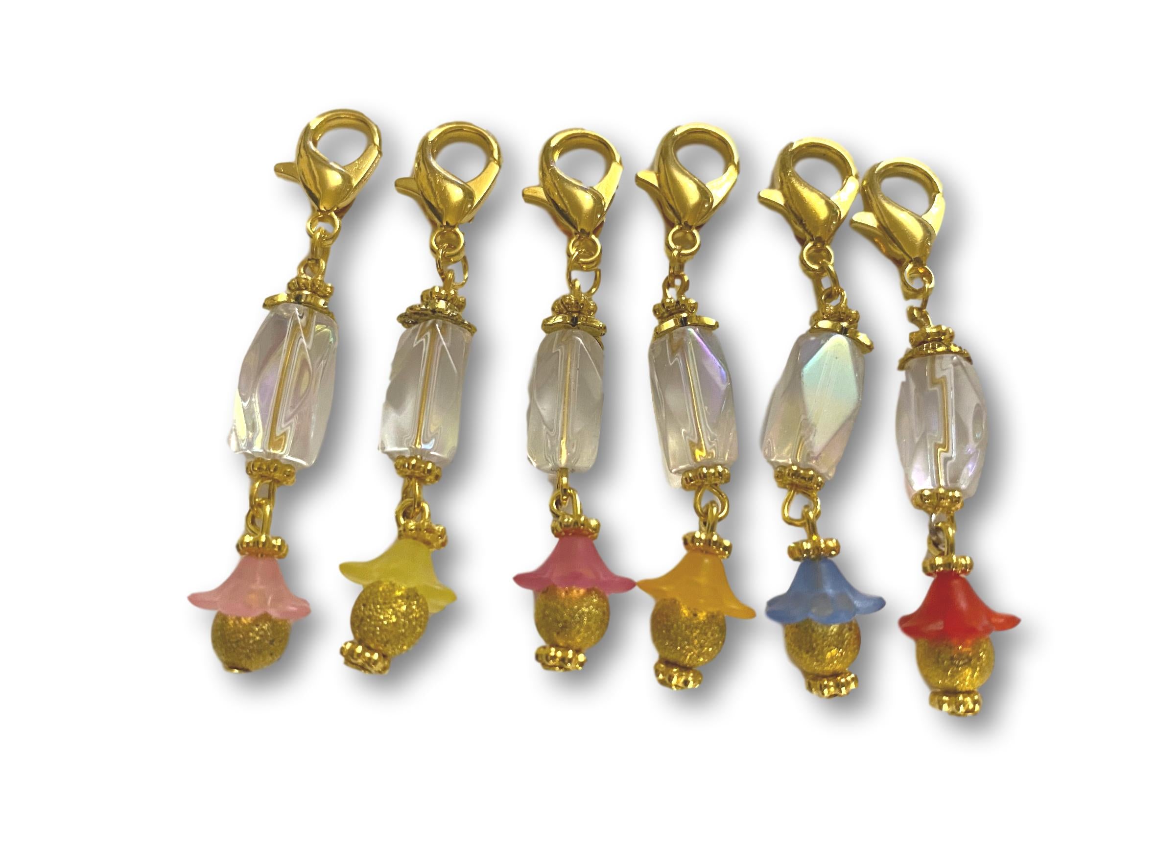 Set of 6 Stitch Markers for Crochet or Knitting with a Crystal and Flower theme design.