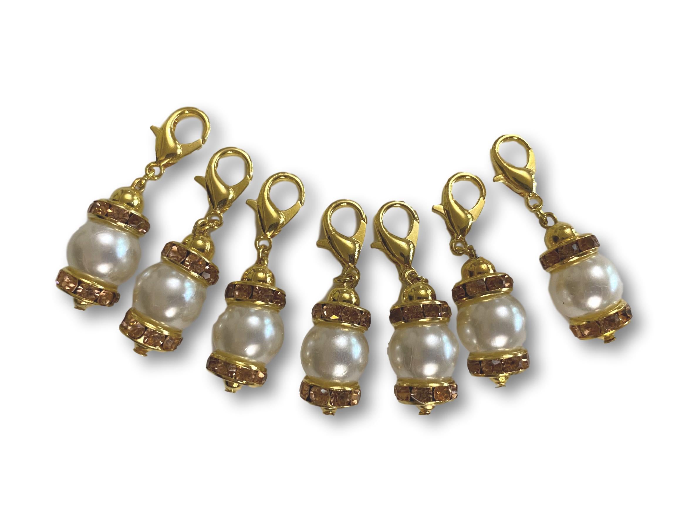 Set of 7 Stitch Markers for Crochet or Knitting with a Crystal and Pearl theme design.
