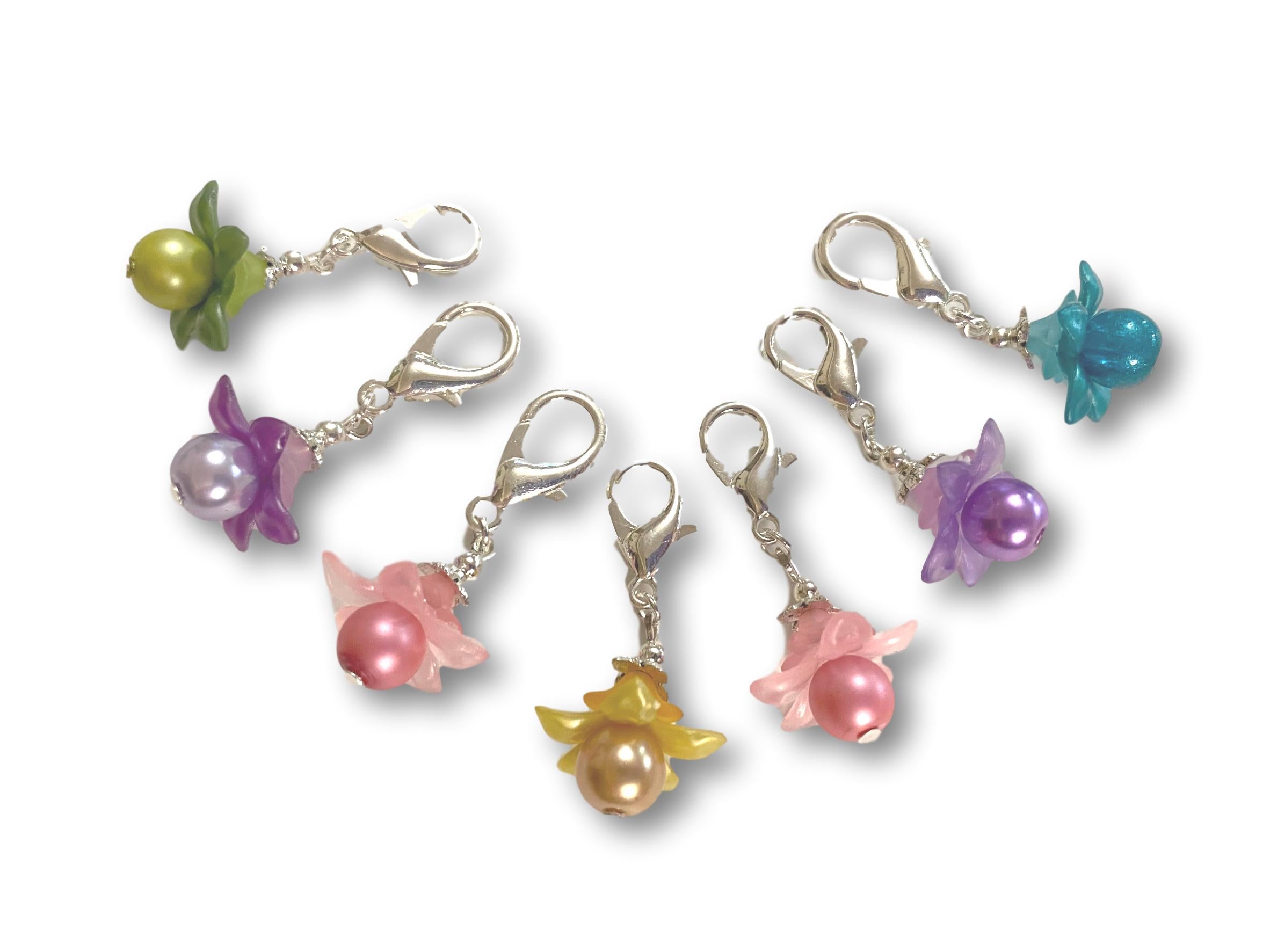 Set of 7 Stitch Markers for Crochet or Knitting with a Flower and Pearl theme design.