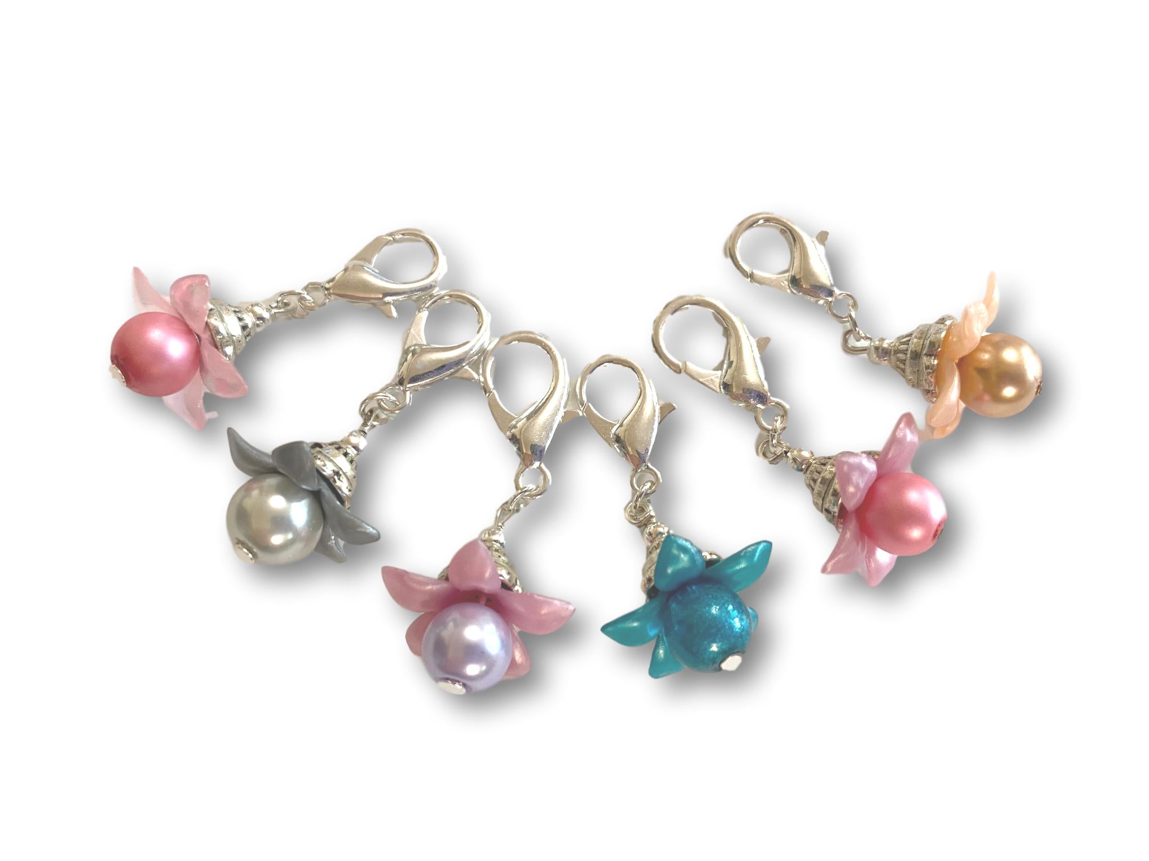 Set of 6 Stitch Markers for Crochet or Knitting with a Flower and Pearl theme design.