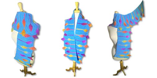 ABOUT THIS PATTERN: This crochet pattern creates a playful and colorful scarf featuring a bright blue base. The scarf is adorned with embossed, leaf-like shapes in a vibrant mix of orange, yellow, pink, and purple. These accents are evenly spaced along the length of the scarf, adding texture and visual interest. The pattern allows for customization with different color choices, making it a versatile and fun accessory for any wardrobe.