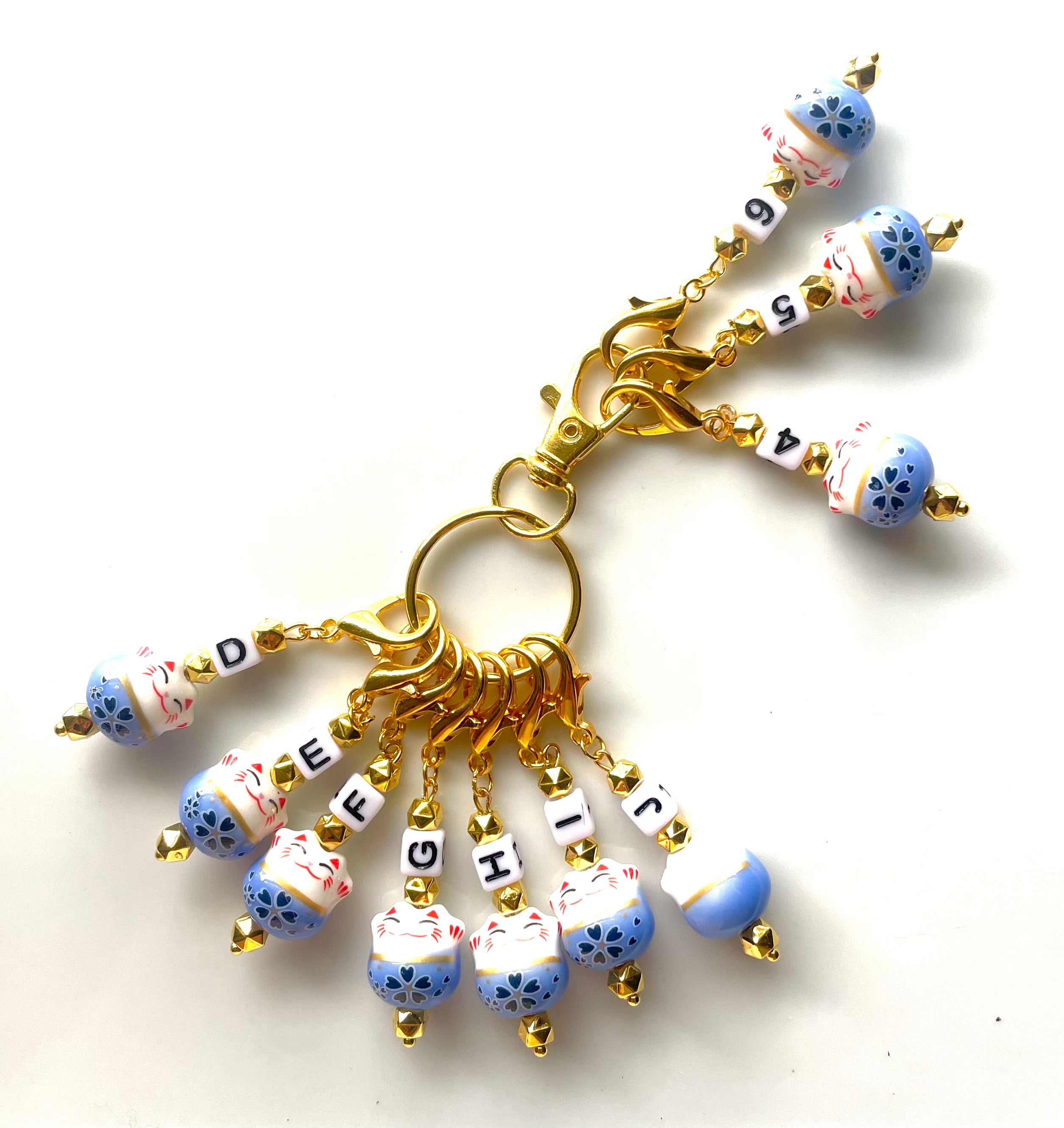 Materials: 14mm White /Blue Ceramic Porcelain Fortune Cats beads, 3mm gold plated spacers beads, White Acrylic Letters/ Numbers and gold plated lobster clasps. Including the Gold Plated Stitch Markers split holder.