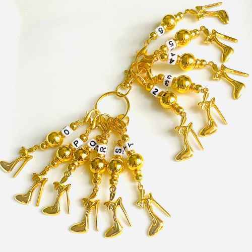 Materials: 10mm Gold plated beads, 4mm spacers, White Acrylic Letters/ Numbers beads, gold plated shoes charms and lobster clasps.