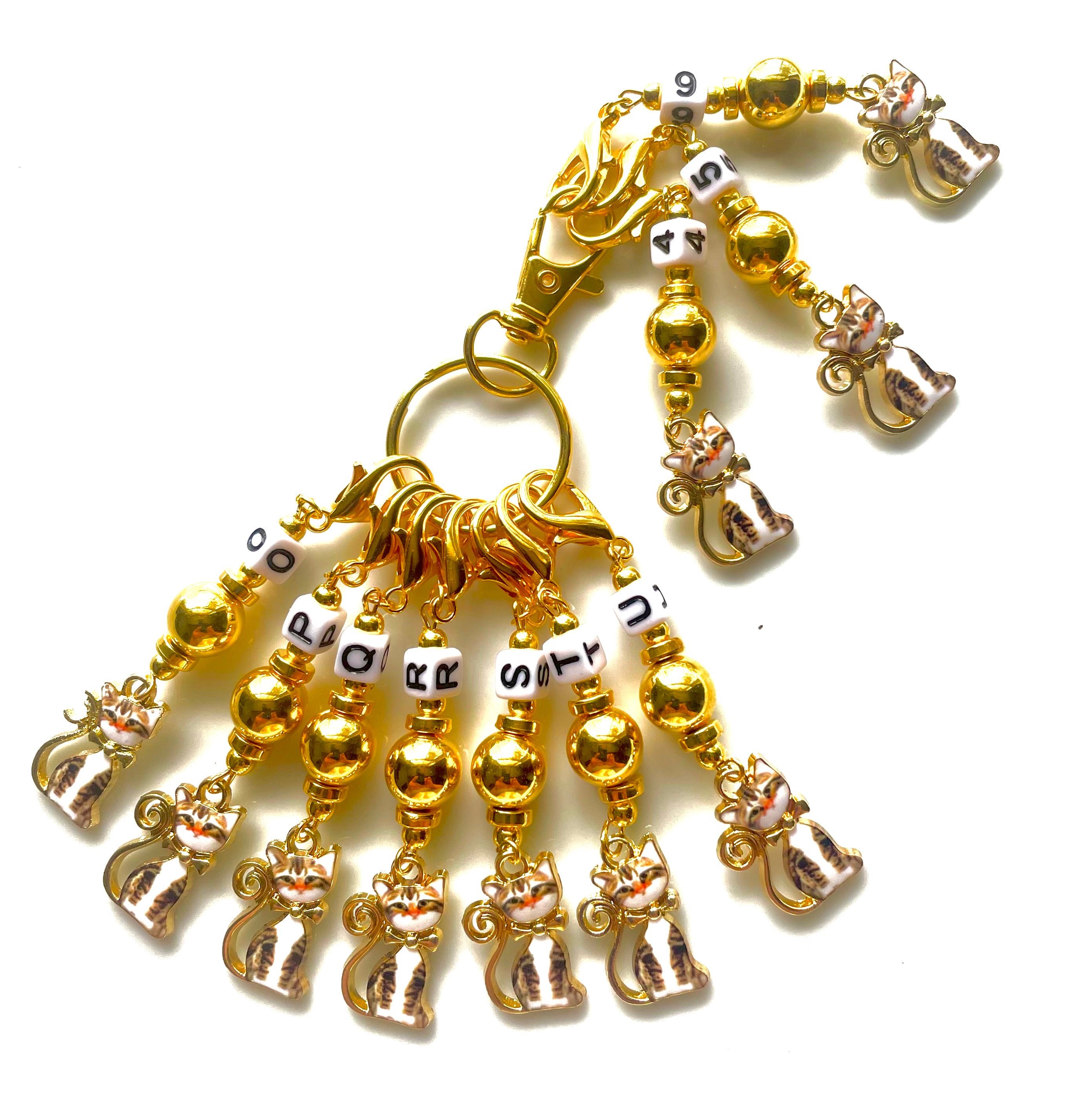 Materials: 10mm, 4mm Gold Plated Beads and spacers, Black/ White Enamel Gold Plated cats charms, White Acrylic Letters/ Numbers beads, gold plated lobster clasps. Including the Gold Plated Stitch Markers split holder.