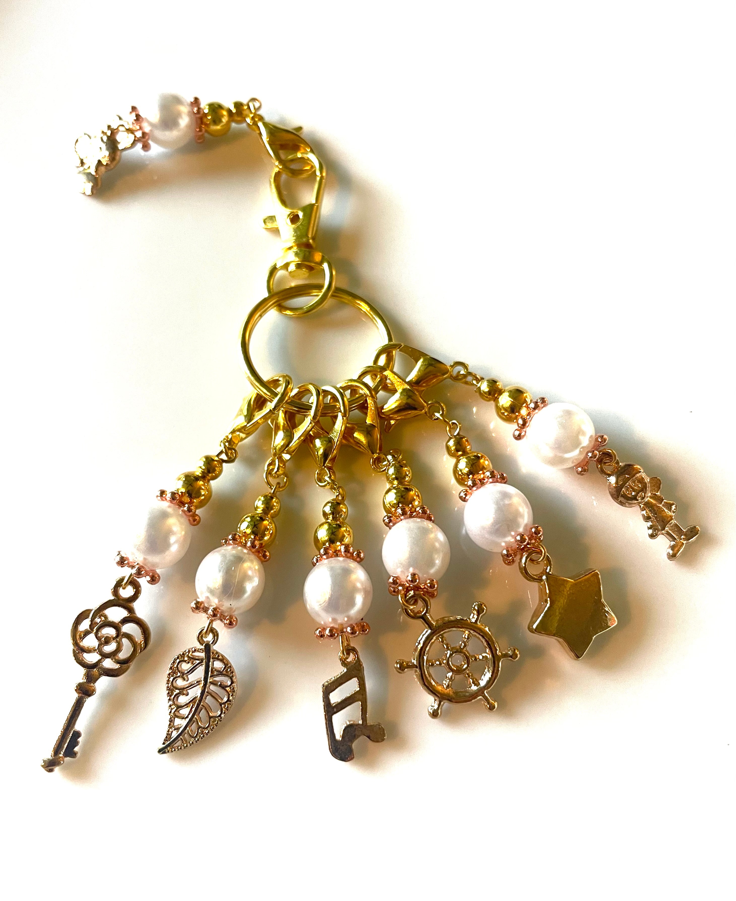 Materials: 10mm White Pearls, 6 mm yellow gold plated beads, rose gold plated star spacers and charms, gold plated lobster clasps. Including the gold plated Stitch Markers holder.