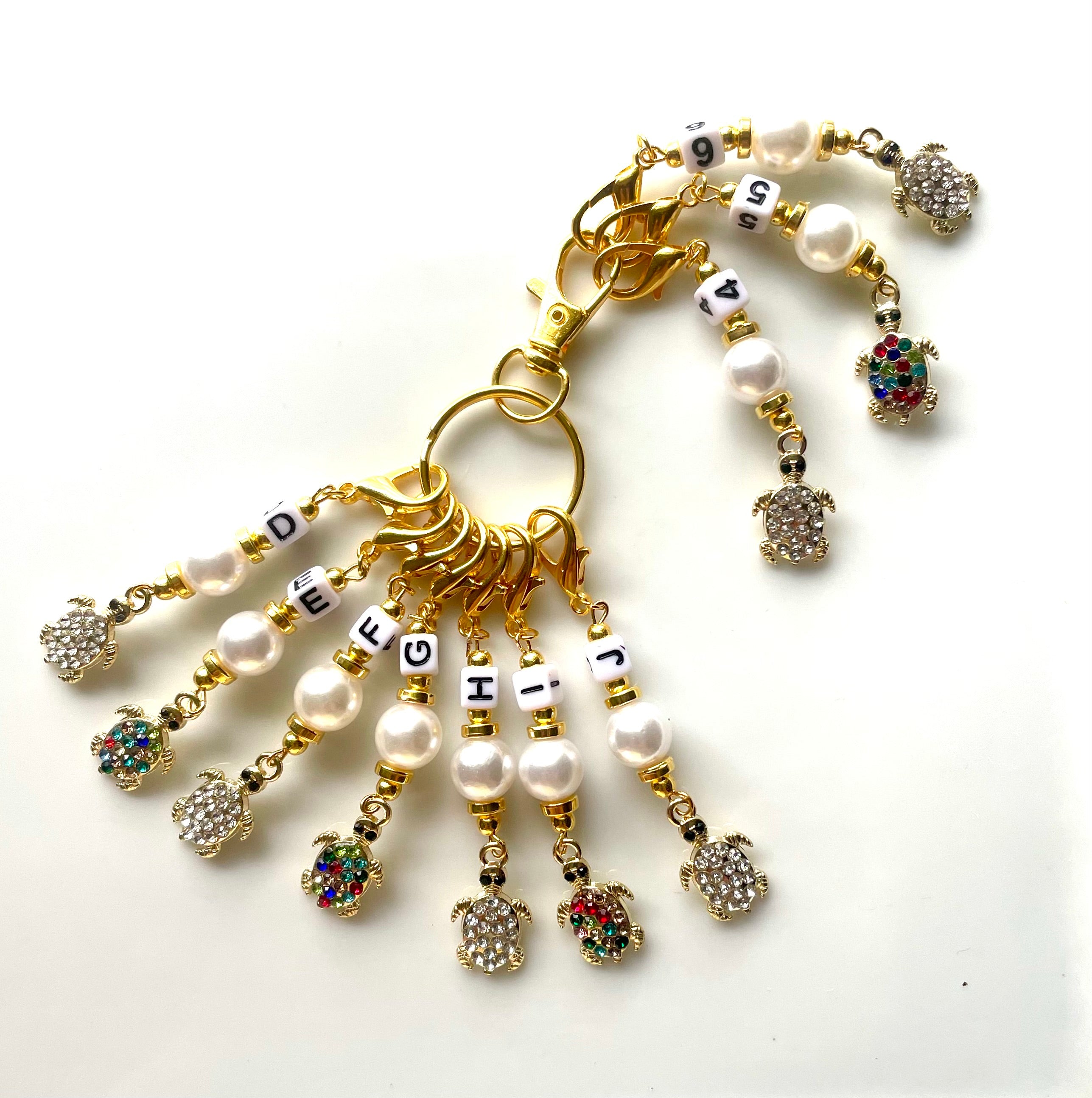 Materials: 10mm White Pearls, White acrylic Letters/ Numbers, gold plated Rinhestone pave, 4mm gold plated spacers and lobster clasps. Including the gold plated Stitch Markers split holder.