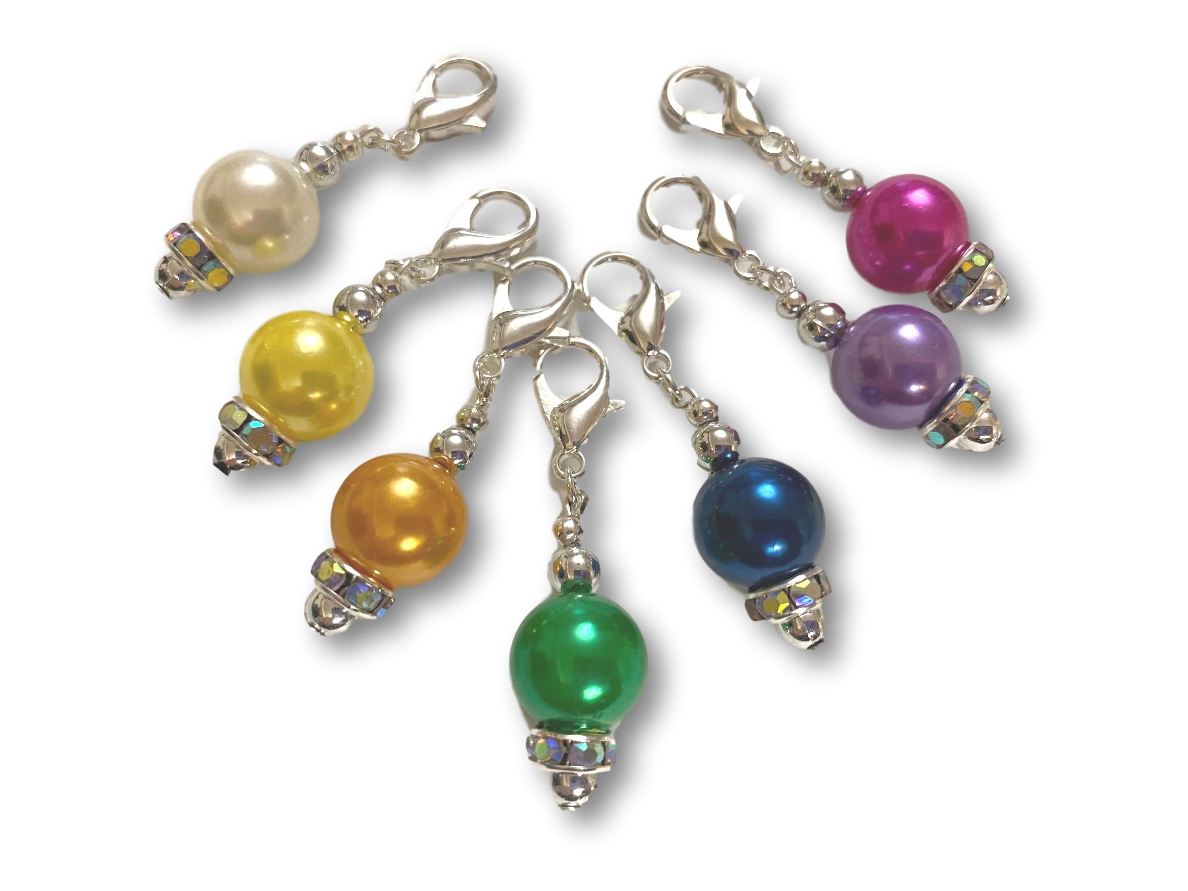 Set of 7 Stitch Markers for Crochet or Knitting with a Pearl theme design.