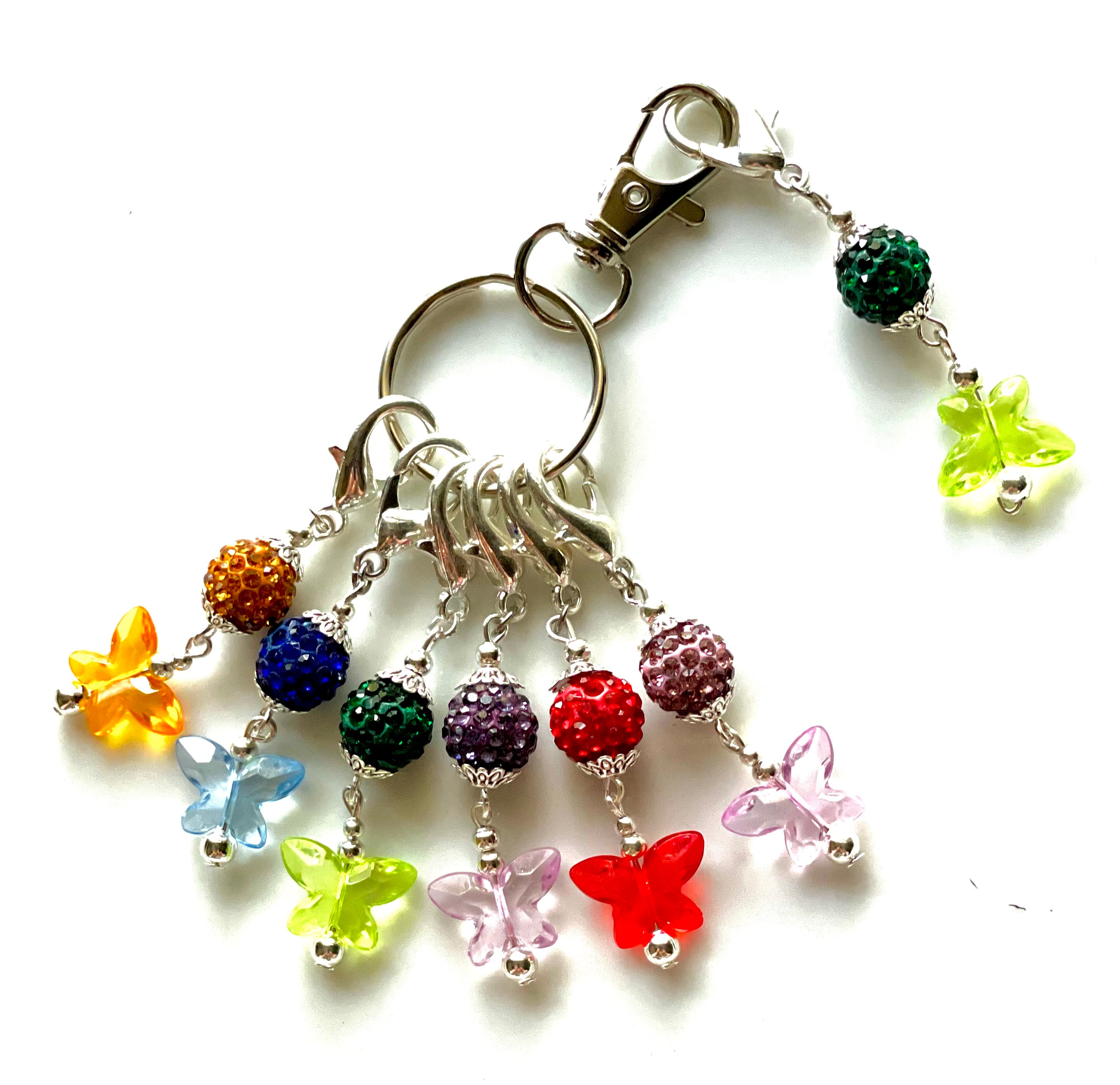 Materials: 10 mm Colored Crystal Rinhestone Pave beads, 8mm Colored Acrylic Butterflies, 3mm silver plated beads, filigree caps, and lobster clasps. Including the silver plated Stitch Markers split ring holder.