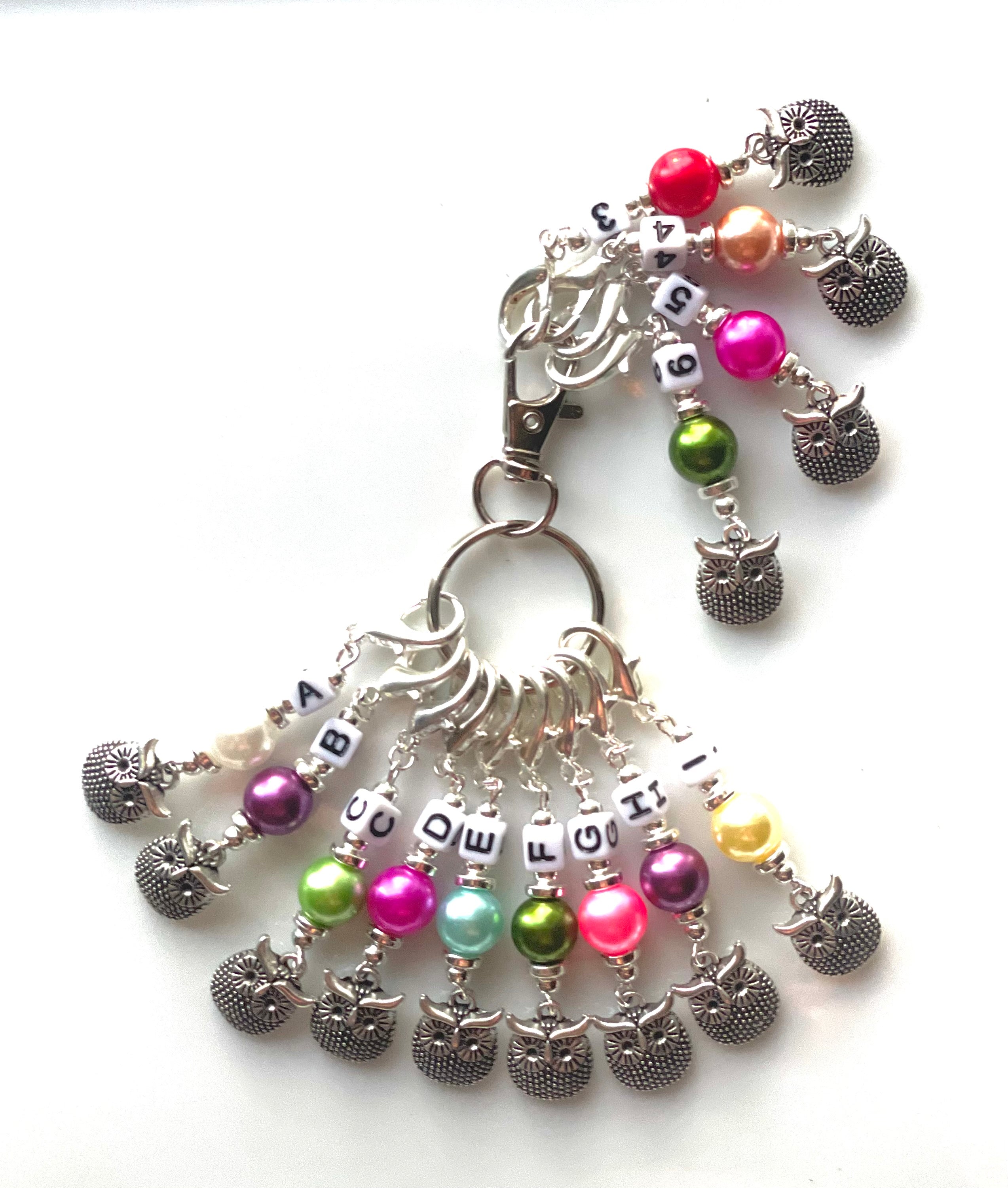 Materials: 10mm Colored Pearls, 4mm silver plated spacer beads, White Acrylic letters/ Numbers beads, Antique Tibetan Owl charms, and silver plated lobster clasps. Including the silver Stitch Markers split ring  holder.