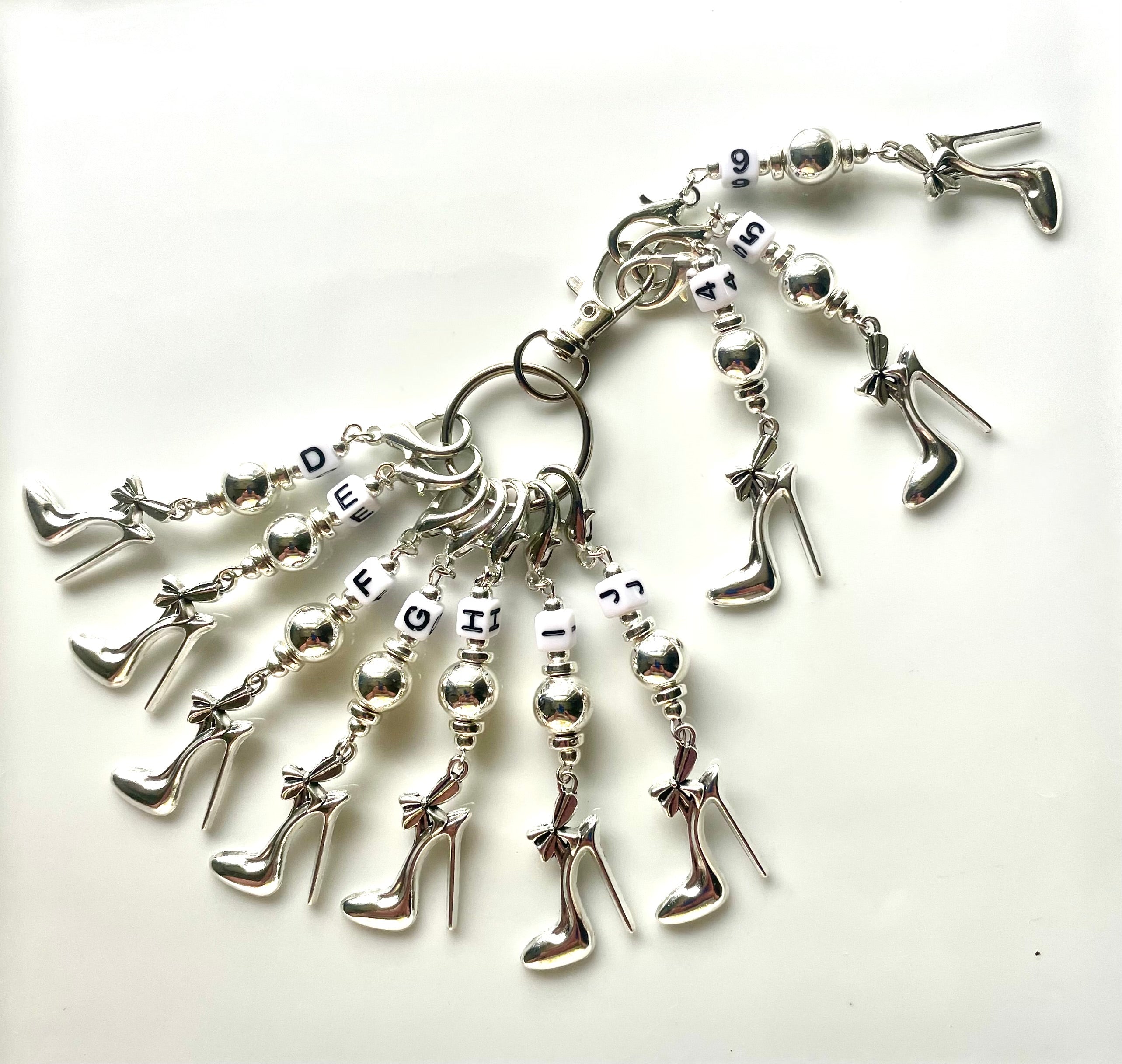 Materials: 10mm, 4mm Silver Pearls and spacers, White Acrylic Letters/ Numbers, silver plated Shoes charms and lobster clasps. Including the silver plated Stitch Markers split holder.