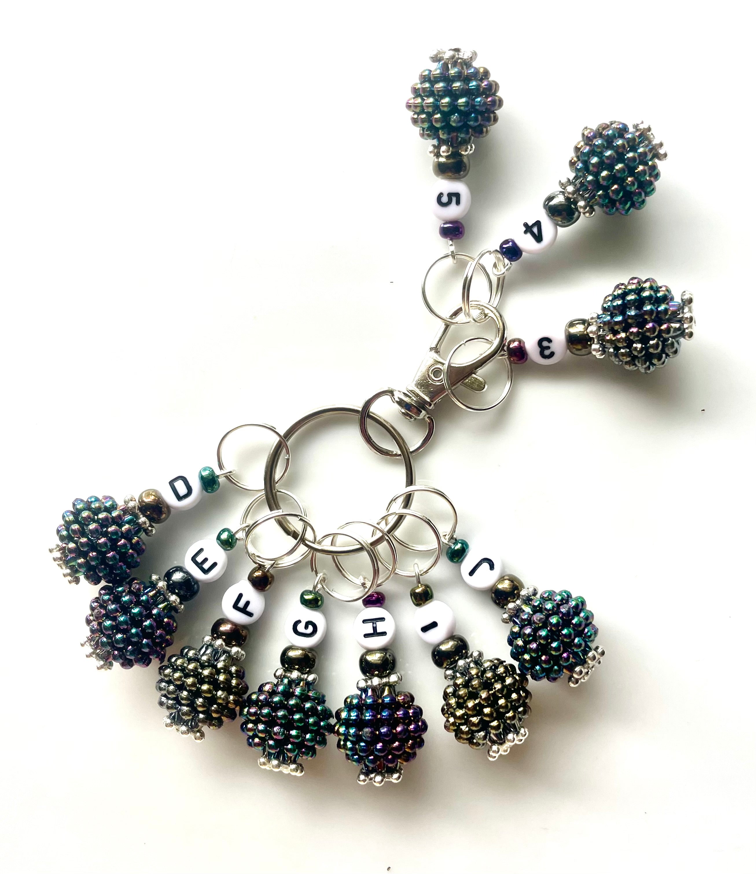 Materials: 12mm Navy Rinhestone Pave beads, 6mm spacer beads, White Acrylic Letters/ Numbers, silver plated caps and split rings clasps. Including the silver plated Stitch Markers split holder.