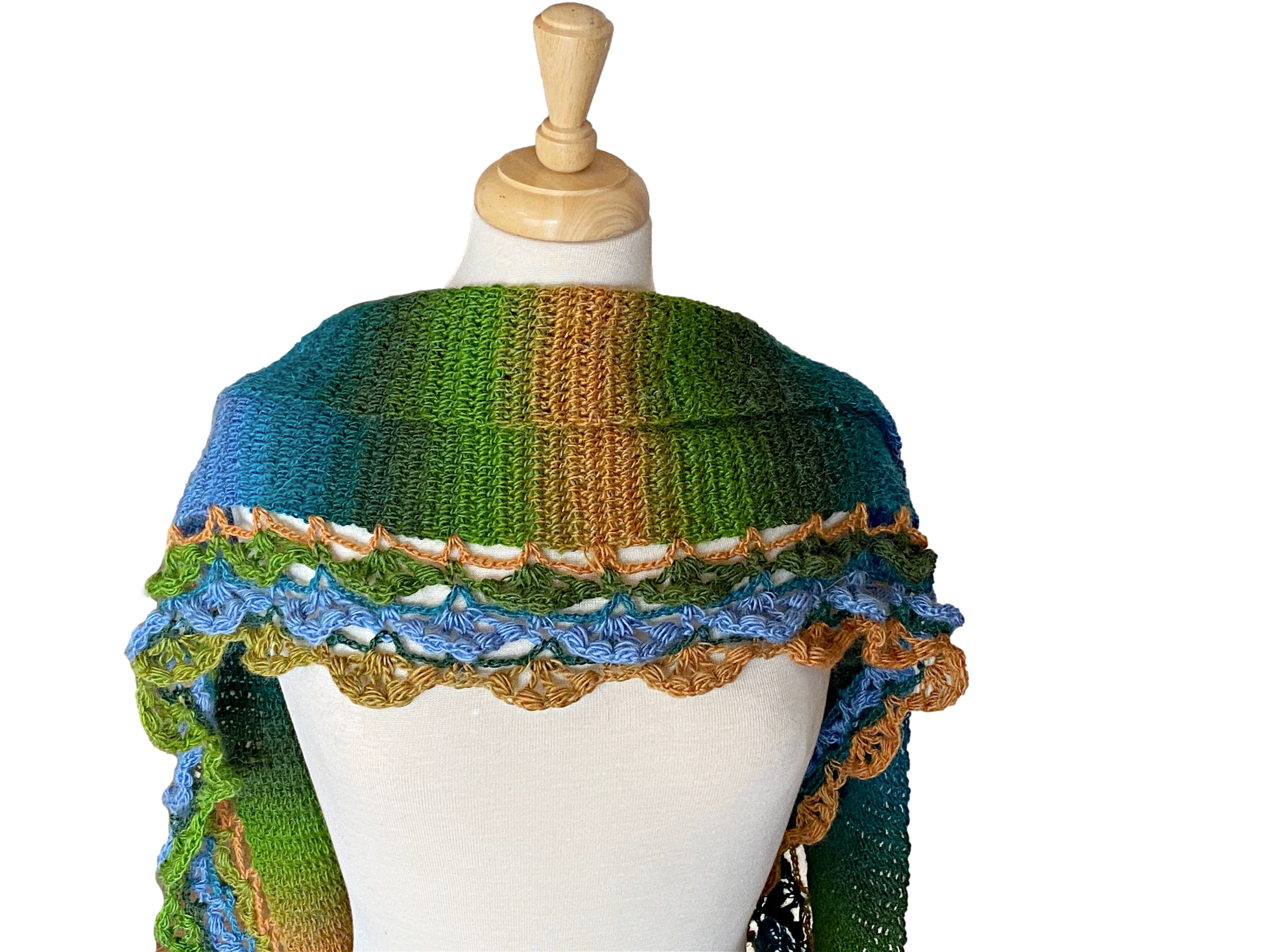 The shawl is a crescent shape, all worked in a self-striping yarn to make the color change mindlessly. Boy, don't we love little ends to weave? I made the sample piece with our Bonita Yarns Soft Dream in Tropicalia colorway. The pattern also suggests our Nirvana Dream collection.